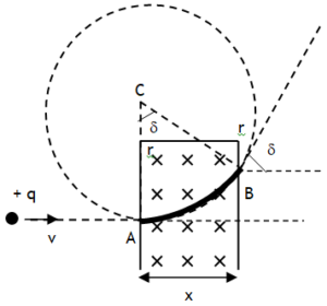 Let x < r be the thickness of the magnetic field region. Let δ is the deviation suffered by the charge particle as it comes out of the region of magnetic field. From diagram we can write